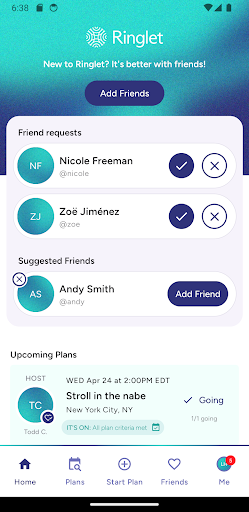 Need support with the children for a few hours? Have an additional concert ticket and wish to see who's free? Ringlet makes it simple to see who's up for what.